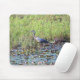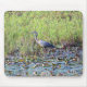 Photo d'un Grand Héron Bleu marchant à travers un étang. L'étang est couvert de nénuphars. L'étang est bordé de plantes de tiges vertes. Copyright ©2021 Kimberly J Tilley.