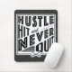 Hockey sur gazon frappe et ne cesse jamais de Tapis de souris. Texte : Hustle, Hit And Never Quit, avec une icône croisée des bâtons de hockey sur gazon.