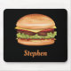L'illustration de Destei d'un hamburger qui a un pain aux graines de sésame garni de fromage, laitue, boeuf, tomate, ketchup et cornichons. Il existe également une zone de texte personnalisable pour un nom ou un autre texte personnalisé. La couleur de fond est noire.