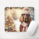 Un Setter irlandais portant un casquette tricoté et une écharpe est assis à l'extérieur dans un paysage enneigé, à côté d'un sapin de Noël décoré et de cadeaux