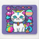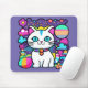Tapis de souris adorable représentant un joli chaton de dessin animé blanc fantaisiste avec de grands yeux bleus, des oreilles roses et portant un collier coloré brillant. Elle a une queue rayée bleue, rose et blanche mignonne et une rayure bleue sur la tête. Le fond est principalement violet avec des planètes, des nuages, des étoiles et des fleurs dans un mélange de couleurs audacieuses, vives et vibrantes. Idéal pour tous ceux qui aiment les chats et l'espace.