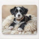 Un petit chiot noir et blanc se trouve confortablement installé sur une couverture et un coussin