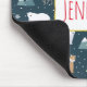 Tapis de souris avec un motif fantaisiste. Ours polaires, rennes, arbres, renards et flocons de neige. Sur un arrière - plan vert foncé. Un cadre rectangle avec une fausse bordure en feuille d'or avec votre nom à l'intérieur.