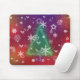 Une dispersion de flocons de neige blancs, de feuilles saints et de baies, d'étoiles et de pins contre un arrière - plan brillant de rouge, d'orange, d'or et de violet, avec au milieu un doux arbre de Noël vert.