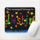 Une mousepad de bonne qualité avec un collage en papier peint à la main et coloré disant "Cette mousepad appartient à Justin" sur un arrière - plan noir. Voir aussi carte de voeux et cadeaux correspondants.