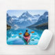 Mousepad with an illustration of a man kayaking in the ocean by the snow topped mountains. Pretty serene blue tranquil water and pine trees surround him on a peaceful journey.