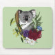 Un mignon ours koala sur un membre d'arbre avec des fleurs et des feuilles d'eucalyptus en toile de fond vert