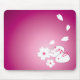 Une mousepad avec une illustration de deux lapins à neige, deux fleurs de sakura et quatre pétales de fleurs de sakura contre un arrière - plan violet dans le coin inférieur droit, laissant de l'espace pour le texte à gauche.