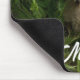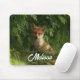 Mousepad avec une photo montrant un mignon petit renard à fourrure rouge et blanche. Entouré de feuilles et d'herbes verdoyants.