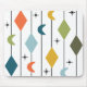 Ce pavé de souris a un design moderne du milieu du siècle de lignes verticales avec des diamants et des boomerangs, avec des éclats éparpillés dans l'arrière - plan.