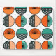 Ce tapis de souris a un design moderne du milieu du siècle de demi-cercles en turquoise et orange avec la moitié d'un starburst dans certains et de minuscules cercles répétitifs dans d'autres.