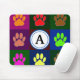 Un chien empreinte de patte coloré motif en rose, orange, bleu, jaune et autres couleurs. La lettre peut être changée pour en faire un pavé de souris personnalisé.