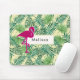Un tapis de souris avec un motif feuille tropical vert et un cadre blanc avec une bordure dorée superposée. Une illustration de flamand rose apporte une touche de fantaisie. Personnalisez avec votre nom ou autre texte à l'intérieur du cadre.