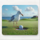 Une mouette place un ballon de golf dans le trou, sur fond pittoresque d'un terrain de golf en bord de mer