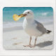 Une mouette tient une chips dans son bec tout en se tenant debout sur une plage de sable, avec l'océan bleu clair créant un arrière-plan serein