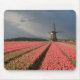 Mousepad avec un paysage avec un moulin à vent et une tulipe rose fleurit dans les rangées à une ferme d'ampoule sous un ciel gris dans la campagne dans Pays-Bas au printemps.