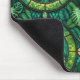 "Mouse pad with a tropical leaf motif, featuring vibrant green leaves in a circular, stained-glass style pattern. A white mouse is shown on the pad."