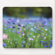 Un champ de fleurs de maïs dans les tons bleu profond et pâle, violet, lavande et rose, avec des feuilles vert pâle.
