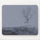 Paysage 3D froid et venteux en hiver, créé en Vue. Sur le sommet d'une colline blanche avec glace et neige, contre un ciel gris orageux avec pluie ou sommeil tombant régulièrement, un érablière nu et solitaire se dresse sous un banc en bois.