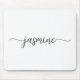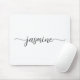 Tapis de souris personnalisé avec nom de monogramme minimaliste noir et blanc girly. Ces conceptions présentent votre prénom dans un joli style de lettrage à la main avec une typographie de queue en arabesque noire sur fond blanc. Ceux-ci sont faciles à personnaliser. Cadeau féminin élégant et stylé pour un anniversaire, une douche de mariée, la fête des mères, un anniversaire de 16 ans et c'est pour la fille qui aime les choses uniques, minimales et stylées.