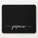 Tapis de souris personnalisé élégant girly noir simple minimaliste monogramme nom signature écriture personnalisée. Ces conceptions présentent votre prénom dans un joli style de lettrage à main levée avec une typographie à queue en fourrure blanche sur fond noir. Ceux-ci sont faciles à personnaliser. Cadeau féminin élégant et stylé pour anniversaire, fête des mères, douche de mariée, anniversaire des 16 ans et c'est pour la fille qui aime les choses uniques minimalistes et stylées.