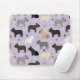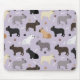 Chien-taureau français mignon avec des couleurs noir, faun, blanc, gris et brindle, des empreintes et des os de chien sur un arrière - plan violet clair.