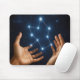 Des étoiles brillantes forment une forme géométrique contre un ciel étoilé, serrées doucement par une paire de mains