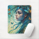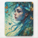Une femme aux cheveux flottants et de couleur aqua est entourée de nombreux papillons colorés, ajoutant un sens de la fantaisie et de la magie à la scène. Son expression est sereine mais captivante, s'harmonisant avec les papillons vibrants qui la entourent.
