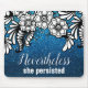 La parties scintillant bleu saphir scintille délicieusement derrière un motif floral noir et blanc. La citation dit "Néanmoins, elle a persisté." Merveilleux pour les entrepreneurs, les activistes et les patrons féministes. Célébrez votre espace de travail avec un peu de plaisir pétillant!
