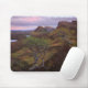Mousepad avec une photo d'un arbre devant les montagnes du paysage de Quiraing avec des couleurs roses dans le ciel au lever de soleil chez Trotternish Ridge sur l'île de Skye en Ecosse, R-U.