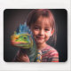 Cette mousepade a une petite fille qui tient un lézard dessus.
