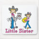 Stick Cowgirls portant des jeans et des bottes roses avec cheval bâton et foin, et texte 'Little Sister '. A la conception de grande soeur assortie.
