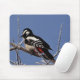 Joli pic tacheté, assis sur une branche enneigée dans le ciel bleu