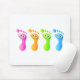 Une rangée de quatre empreintes de pas humaines colorées avec les visages heureux.