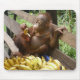 Cet orang-outan mignon de bébé apprécie un pique-nique des bananes, se reposant sur les épaules d'un autre orphelin au sanctuaire en Indonésie. Reposez-vous de retour… détendent… et utilisent vos orteils pour tenir votre banane. Elle facilite l'épluchant sooooo beaucoup.