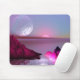 Un 3d coloré rend d'un océan au coucher du soleil avec une planète qui semble lumineuse, pourrait être les formations de roche en cristal et colorées d'océan sur une mer de lavande.