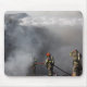 Un tapis de souris avec une photo de pompiers qui combattent un incendie de maison.