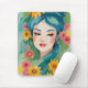 Ce design dynamique et fantaisiste présente un portrait abstrait d'une femme aux cheveux bleus turquoises ornés de fleurs colorées. Son expression sereine est accentuée par les yeux fermés et les lèvres rouges, lui donnant un aspect onirique. Elle est entourée de tournesols vibrants, de fleurs roses et d'un éventail de feuillages verts, créant une atmosphère luxuriante et de jardin. La pièce a un style doux et vectoriel, qui lui donne une sensation moderne mais romantique. La palette de couleurs est dominée par les teals, les jaunes, les roses et les verts, créant une composition harmonieuse et attrayante.