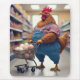 Un poulet caricatural, habillé d'une chemise en vichy et de couloirs en denim, pousse un chariot rempli d'oeufs dans l'allée d'une épicerie