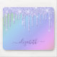 Tapis de souris scintillant personnalisé avec fausse parties scintillant violette qui s'écoule du haut contre un arrière - plan arc-en-ciel rose pastel, violet, bleu et vert unicorne. Ajoutez votre prénom dans un script mauve design et tendance avec des swashes.