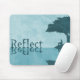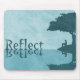 Dessin texturé vert-bleu représentant la silhouette d'un homme assis sous un arbre près d'un étang qui contemple. Le mot "Reflet" repose sur la surface du lac, le texte et les ombres reflétés dans l'eau parfaitement calme.