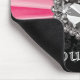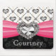 Personnalisez ces jolies roses indien et tapis de souris noir de damassé avec un ruban fuchsia de satin et conception de coeur de fausse pierre avec votre nom. Un coeur de diamant et une conception de solitaire sur le rayage subtil composent le dessus de cette conception. Illustration et © Chrissy H. Studios, LLC de conception. Tous droits réservés.