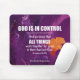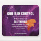 Christian Scripture MOUSE PAD with the Bible verse from Romans 8:28 - ALL THINGS WORK TOGETHER FOR GOOD - and the heading reads GOD IS IN CONTROL. The placeholder name is CUSTOMIZABLE, so you can PERSONALIZE by replacing with your name or choice of text. Part of the INSPIRATIONAL PRINTS Collection by Berean Designs.