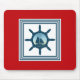 Nautical themed design with sailing scene decoration in striped squares on red background