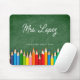 Un clavier de souris moderne et personnalisé pour les enseignants avec un arrière - plan en damier vert avec des crayons colorés. Nom de l'enseignant en script. Texte personnalisé en bas dans une police serif.