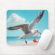 A seagull flies gracefully over a sandy beach, clutching a red and white polka dot bikini top in its beak