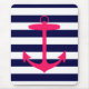 Une silhouette rose lumineuse et au néon d'une ancre est sur un arrière - plan rayé de bleu marine et blanc. Un amusement, conception nautique.