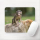 Mousepad avec le singe de bébé sur des mères soutiennent. Si mignon, accrochant un tour et regardant vers le bas le monde.