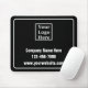 Cette mousepade promotionnelle est noire et blanche. La bordure est blanche. Vous pouvez remplacer l'image d'affichage par le logo de votre entreprise. Il apparaît au-dessus du texte pour le nom de votre entreprise, le numéro de téléphone et le site Web. Le texte est blanc. Tout le texte peut être modifié ou supprimé.