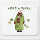 Un bonhomme de neige à l'allure de pays ancien portant une robe verte et rouge, des pantoufles du matin lapin, un foulard, des étoiles vertes et dorées, et un texte qui dit "C'est la saison" sur des T-shirts, des cartes, des tasses, des magnets, des sacs fourre-tout, et plus encore.